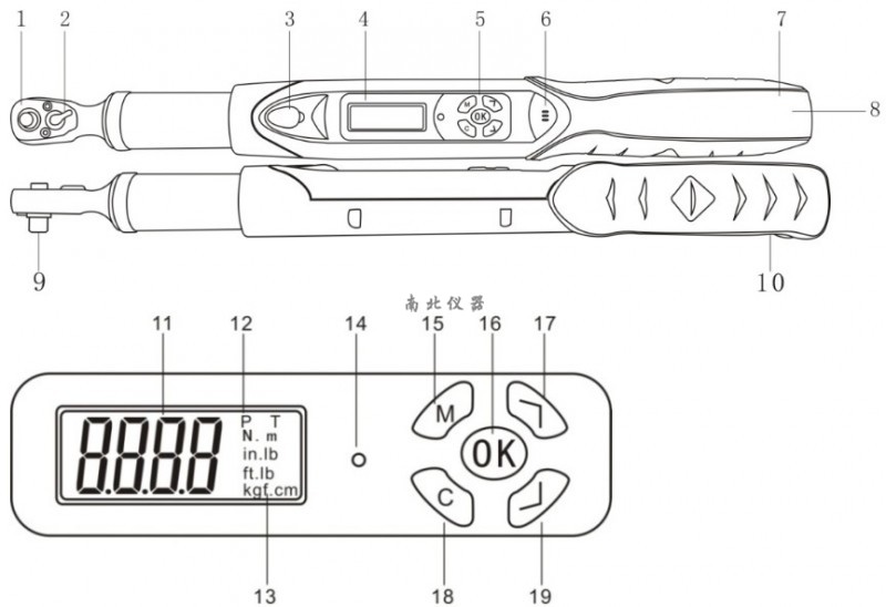 9、棘轮扭力方头 19、向下按键