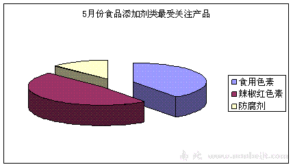 食品添加剂方面,本月搜索较多的产品是使用色素、辣椒红色素以及防腐剂产品。对比上月的分析数据,辣椒红色素都是关注度较高的食品添加剂产品。