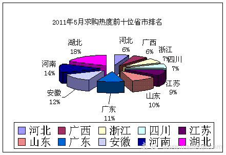 5月份求购热度前十位省市排名依次为:湖北、河南、安徽、广东、山东、江苏、四川、浙江、广西、河北。湖北超越广东成为本月采购热度的省市。