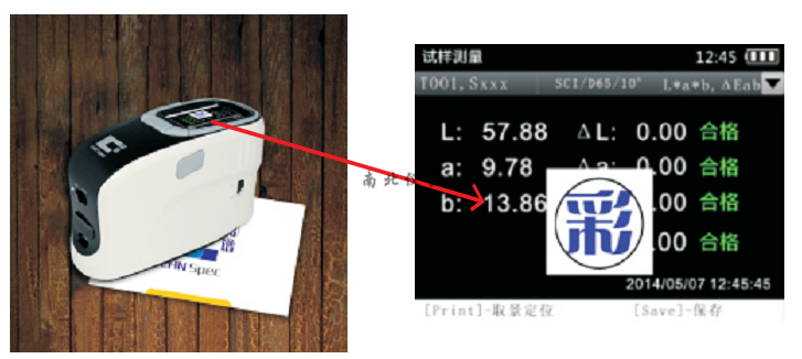 显示:光谱图/数据,样品色度值,色差值,合格/不合格结果,颜色偏向,显示测量区域,历史数据色彩,手动输入标准样,生成检测报告