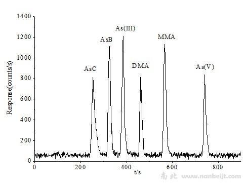 图2.AsC、AsB、As (III)、DMA、MMA和As (V)混合标准液CE-ICP-MS图