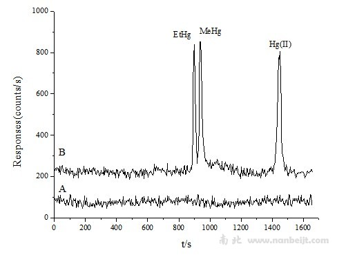 图4.MeHg、EtHg和Hg(II)混合标准液CE-ICP-MS图