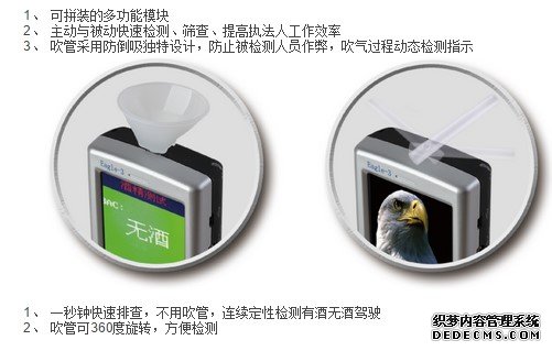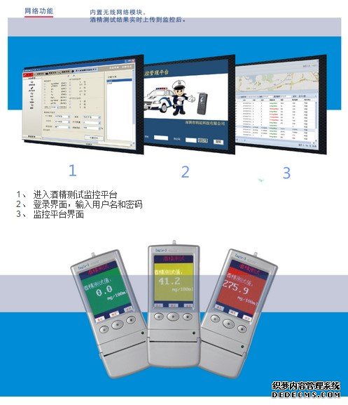 3、 网络式酒精检测功能,测试结果通过无线网络会上传到监控后台,做到了实时、及时的特征,自动统计每次酒后或醉酒次数。